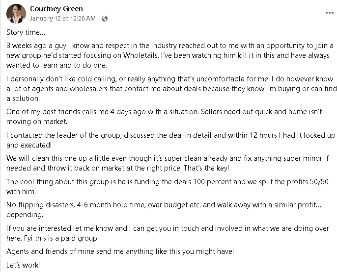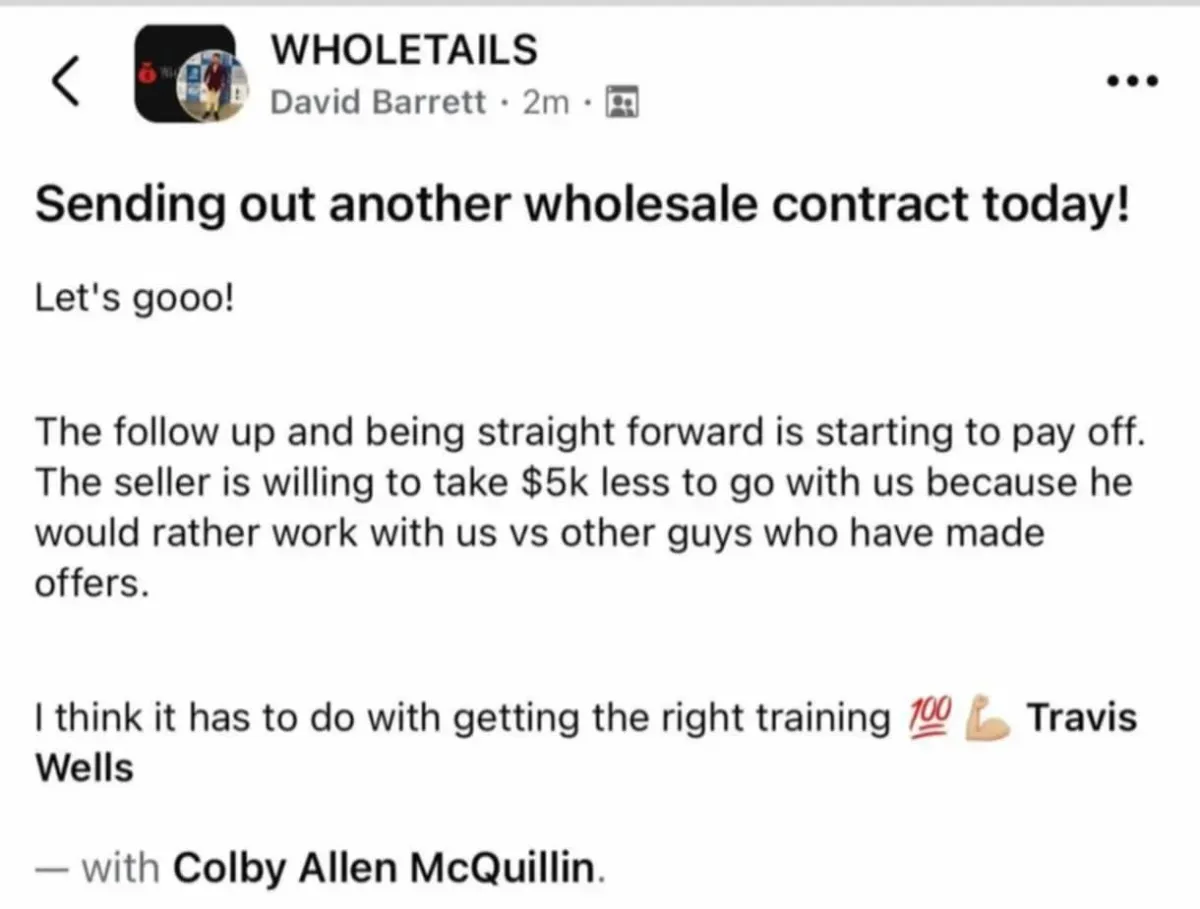 This is the same strategy I use daily—just last week, someone in my group inked a Wholetail deal with a $40k potential spread. I’m funding the deal, and we’re splitting profits 50/50.